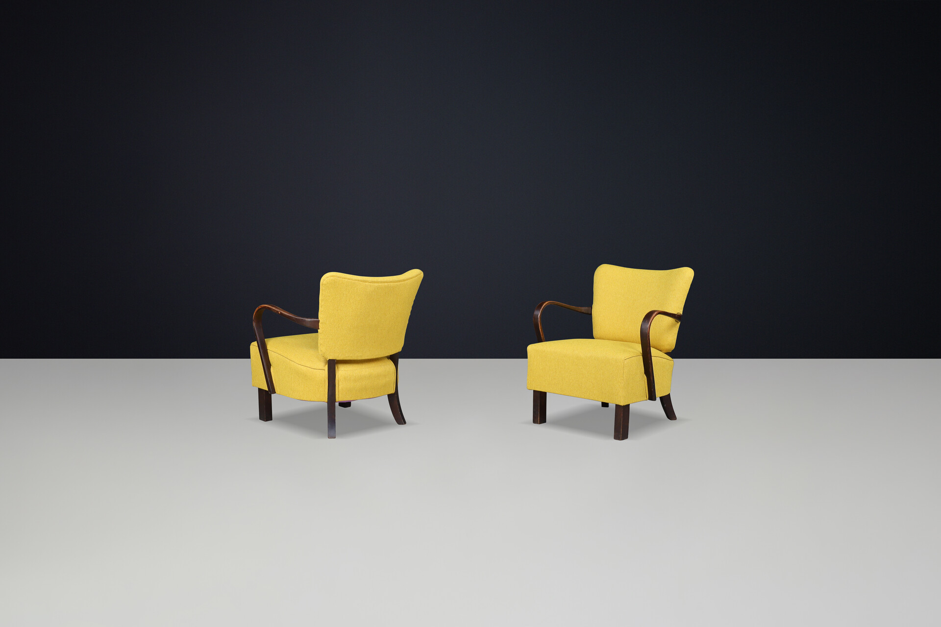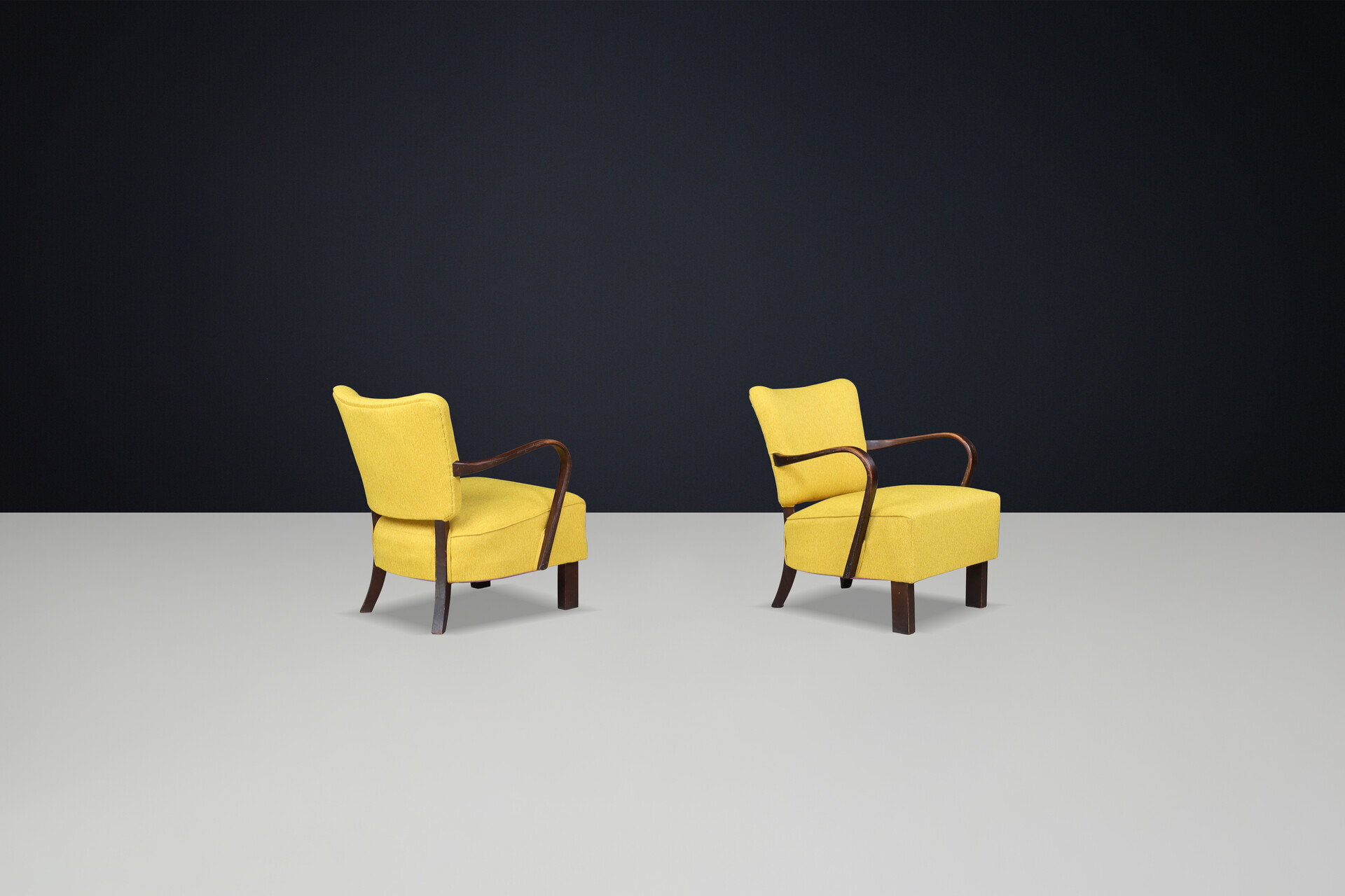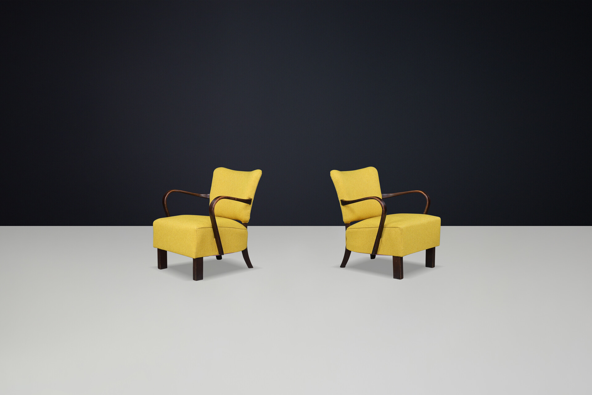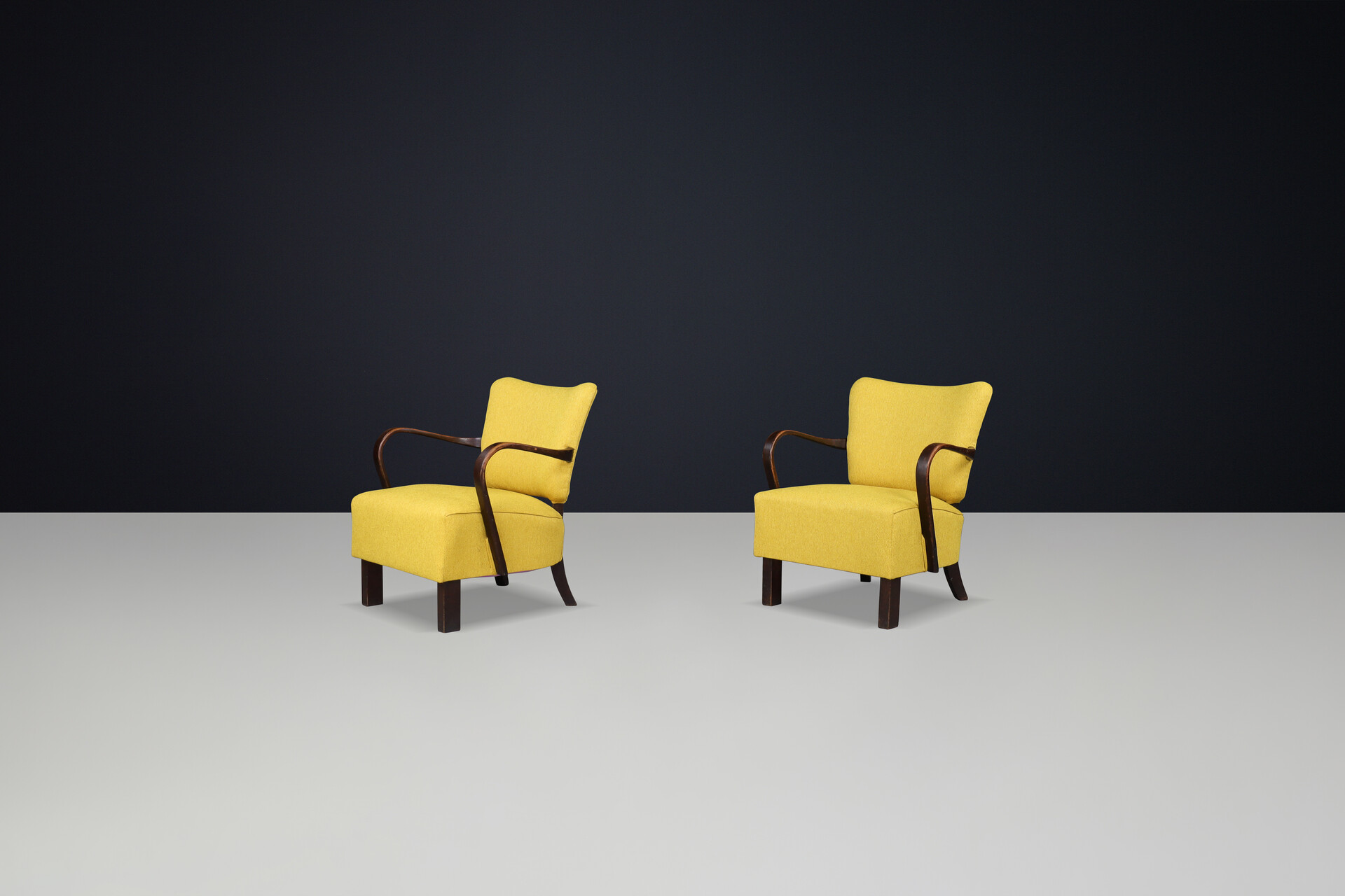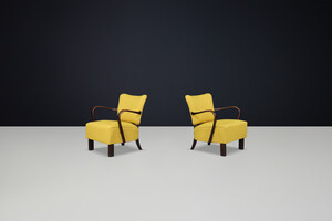 JIndrich Halabala re-upholstered patinated bentwood lounge chairs from the 1930sOrigin:
